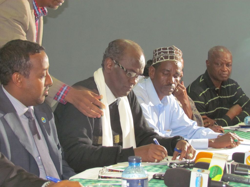 Mohamed Abdi Mohamed (center) signs documents during the Jubbaland conference. He is an anthropologist, historian, and former Minister of Defense of Somalia.