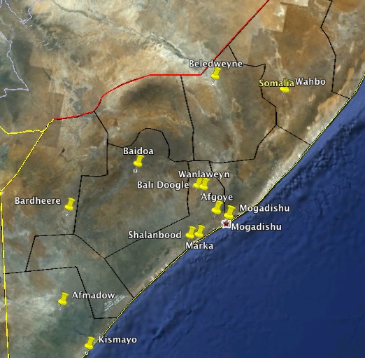 Setting this aside, the number al-Shabaab attacks have remained consistant throughout South Central Somalia.  The map below shows some of the locations (without noting multiple incidents) of al-Shabaab attacks in the last two weeks: