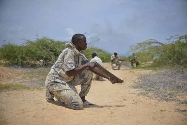 Large contingents of Somali soldiers have been training in Uganda, Djibouti, and Somalia by multiple partners—including the United States, the EU, and AMISOM. Training has been successful overall but at times hampered by a lack of equipment, including guns and combat gear, as pictured on the left.