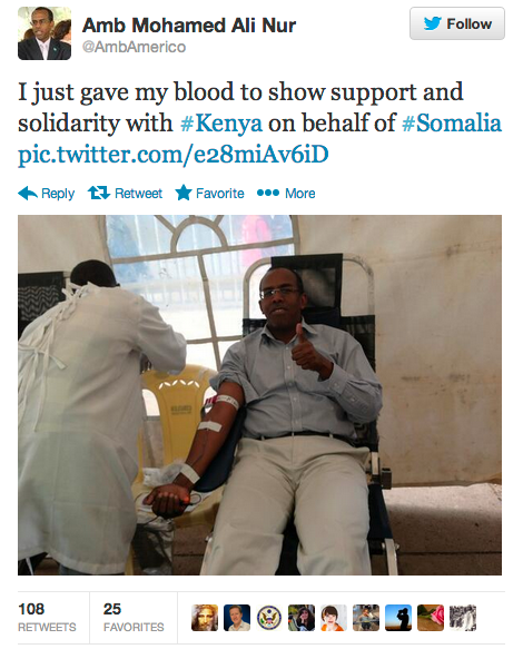 Somalia’s Ambassador to Kenya even tweeted a photo of himself giving blood with many others to support Westgate victims.