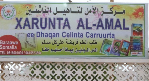 ‘Al-Amal sign’ Published July 2, 2014 at 587 × 320 in Al-Shabaab Opens Center for Disadvantaged Youth Al-Amal Center sign ‹ Back