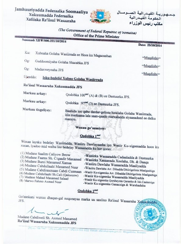 In a 25 October 2014 statement, the PM removed the Farah Sheikh Abdulkadir — President Hassan Sheikh Mohamud’s right-hand man — from the position of Minister of Justice and Constitutional Affairs and re-assigned him as Minister of Veterinary and Animal Husbandry, among other changes.