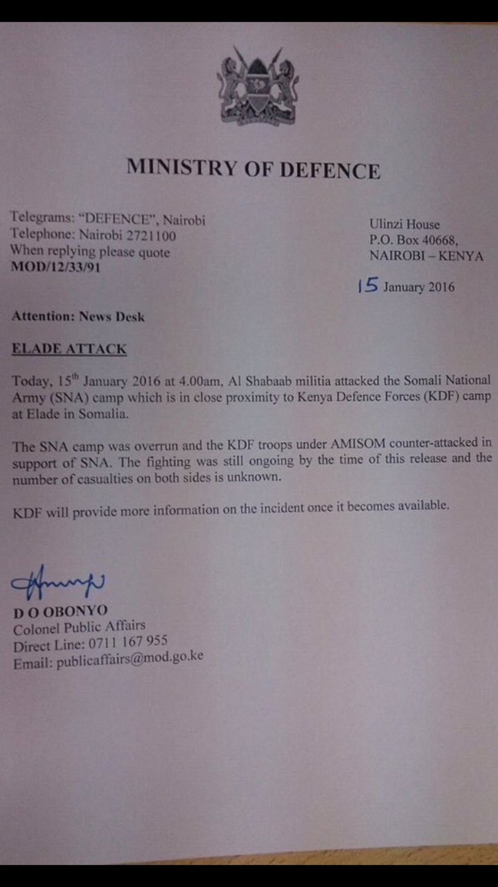 The Kenyan military initially claimed al-Shabaab attacked a Somali camp next to the Kenyan camp and KDF were simply responding as counter-attackers in support of the SNA. Kenyan media also ran with this version of the story in national headlines.