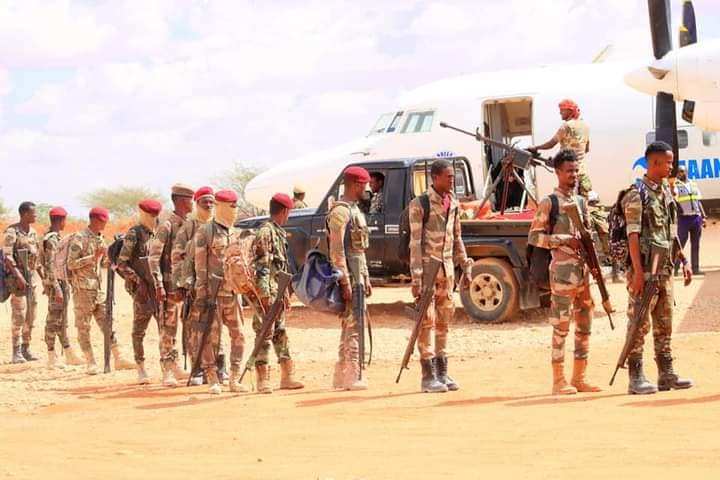 Despite some belief that the aircraft was ferrying FGS troops, press photos show Turkish-trained “Gorgor” army forces arriving in Doolow on an aircraft flown by commercial company Maandeeq Air.