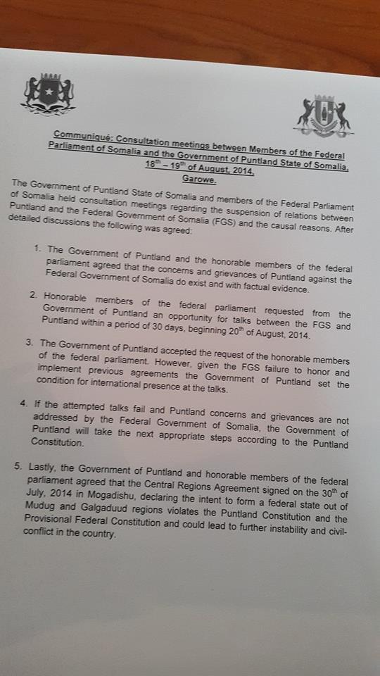 2. Honorable members of the federal parliament requested from the Government of Puntland an opportunity for talks between the FGS and Puntland within a period of 30 days, beginning 20th of August 2014.